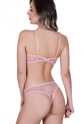 Conjunto Lingerie de renda com uma combinação incrível com dois modelos de rendas numa peça. O sutiã trás um detalhe de triângulo no bojo de forma ousada e muito linda, com o bojo estruturado na pala e também no bojo. A Tanga é uma super combinação também de rendas que deixa a peça delicada e linda somente na renda.