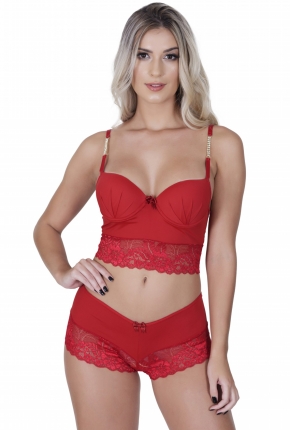 Um cropped com colchete largo e uma pala de renda que trás uma beleza a mais para a parte de cima.