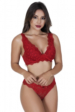 Conjunto de lingerie todo produzido em renda com bojos pré-moldados, arcos que estabelecem sustentação aos seios, com uma linda alça elástica ajustável coberta por renda na parte da frente que deixa esse sutiã belíssimo. Sua calcinha toda em renda elástica modelo fio dental, forro 100% algodão.Uma combinação perfeita de conforto e sensualidade