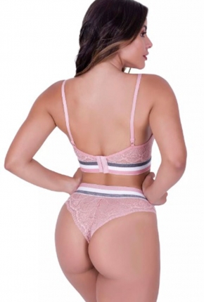 Todo confeccionado em renda, o sutiã de bojos pré-moldados e arcos que proporcionam sustentação aos seios, seus colchetes com três regulagens e alças que se ajustam ao seu corpo, tem como diferencial sua pala sensual e também sustentável em listras.